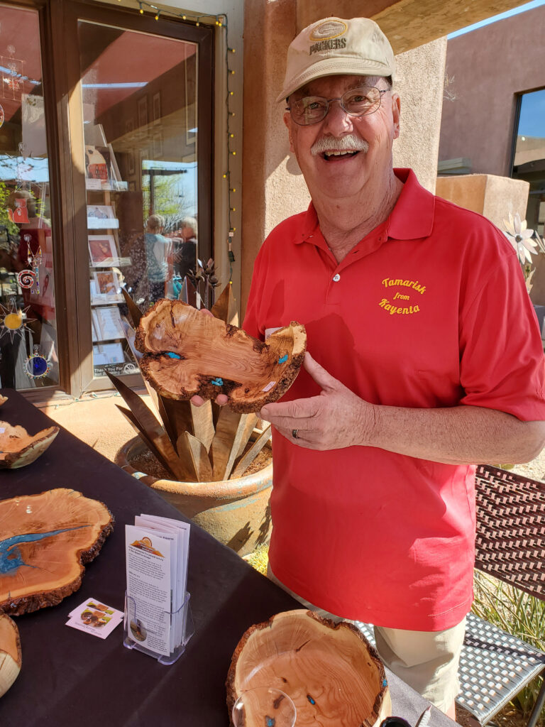 SUW Vice-President Bill Vincent shared the offer with woodturners from Las Vegas to Cedar City, noting that “tamarisk has a lot of character making it a nice choice for woodturning small items.” The advantage of obtaining the wood in log form allows the artist to cut it “to take advantage of the natural character of the wood such as the crotch and knots.”