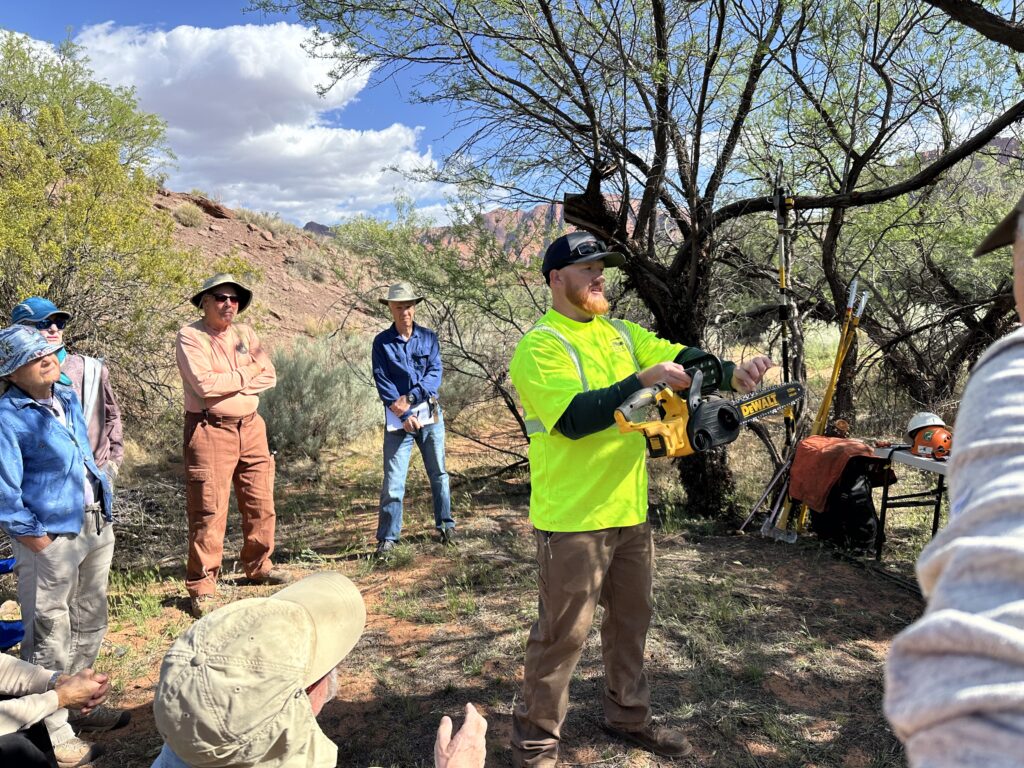 The well attended safety Desert Preservation Initiative workshop conducted by Ivins City Parks Superintendent Joseph Rawlinson May 13 offered critical advice on using the equipment needed to accomplish DPI’s goal of removing the highly flammable invasive tamarisk. Addressing key safety procedures and practices, Rawlinson led the group through ways to increase their efficiency and effectiveness, thereby making it easier to maintain their commitment to this work.