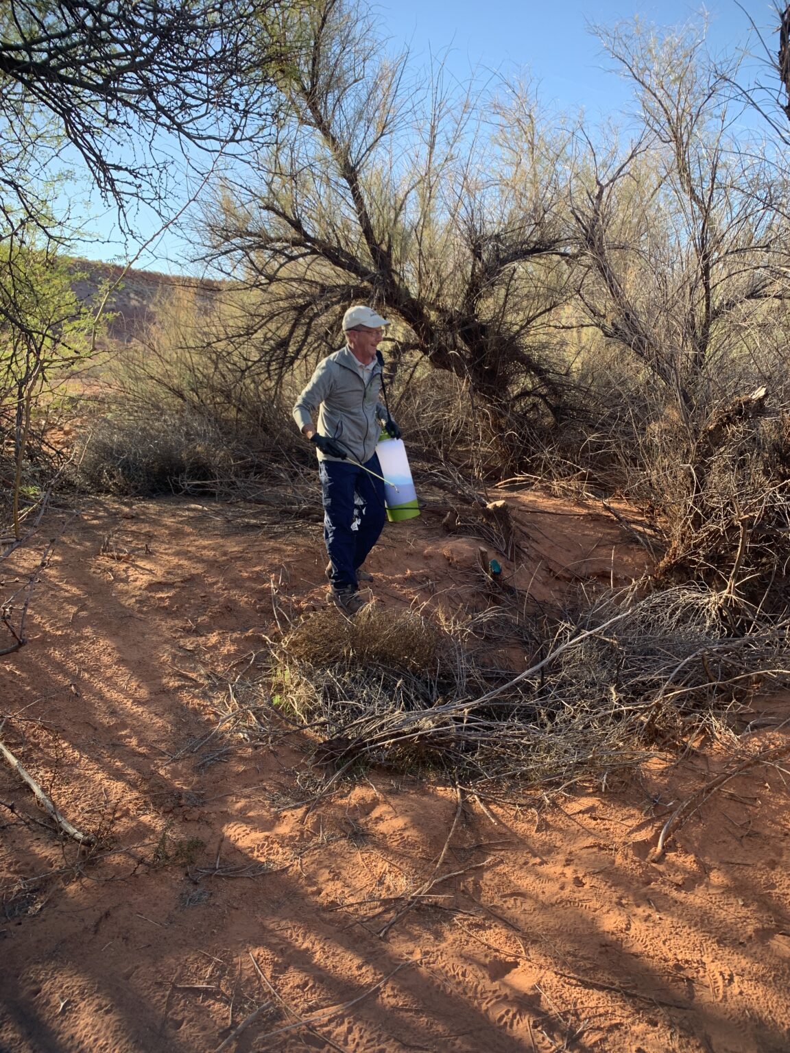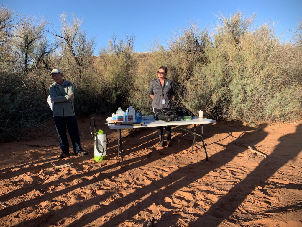 How should you dress to safely handle even a low-level pesticide? Why is it important to treat tamarisk within ten minutes after it is cut? These and other questions about safety and science were among those answered for volunteers and directors of the Desert Preservation Initiative at a recent hands-on herbicide training and safety workshop in the Kayenta Wash in the city of Ivins.